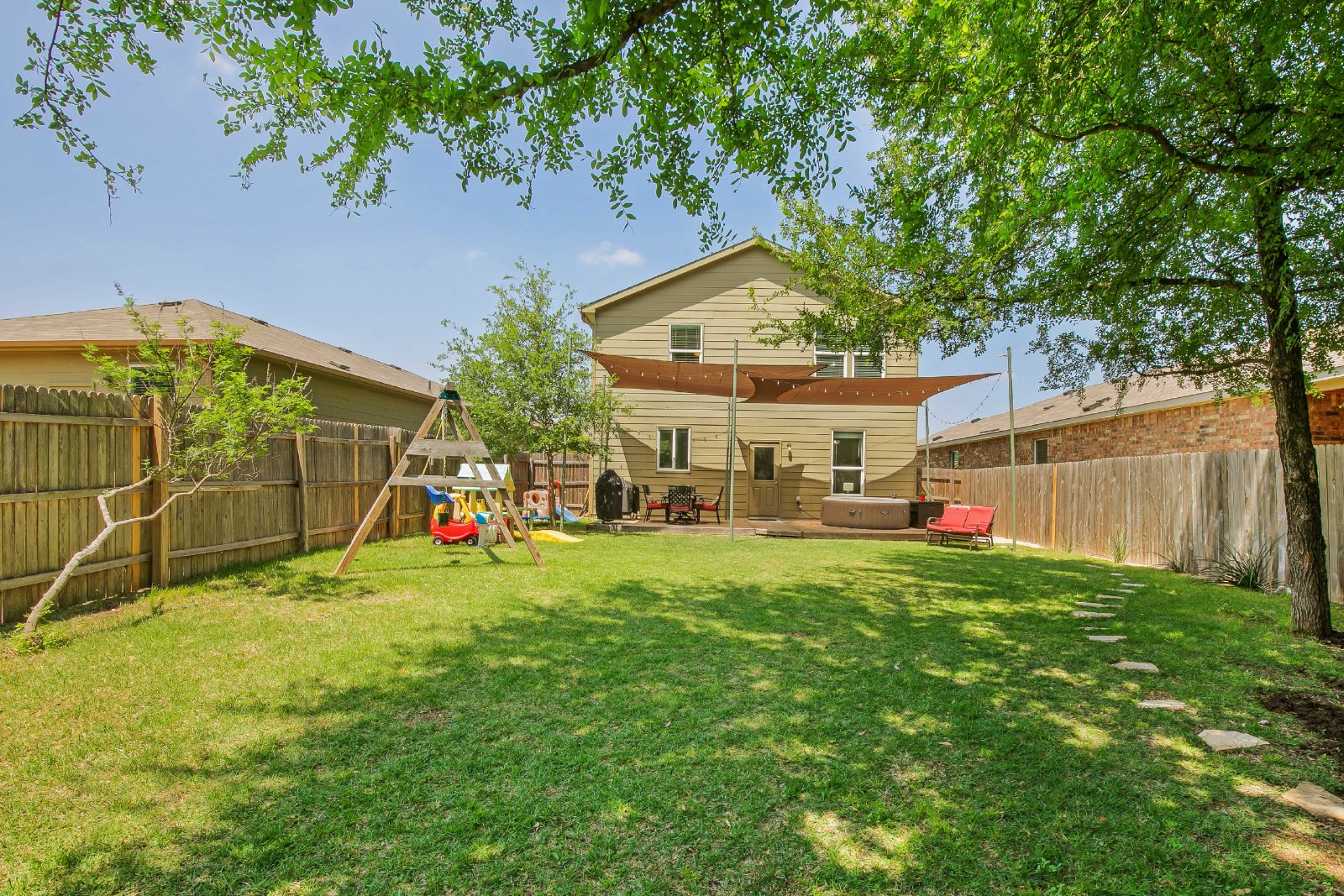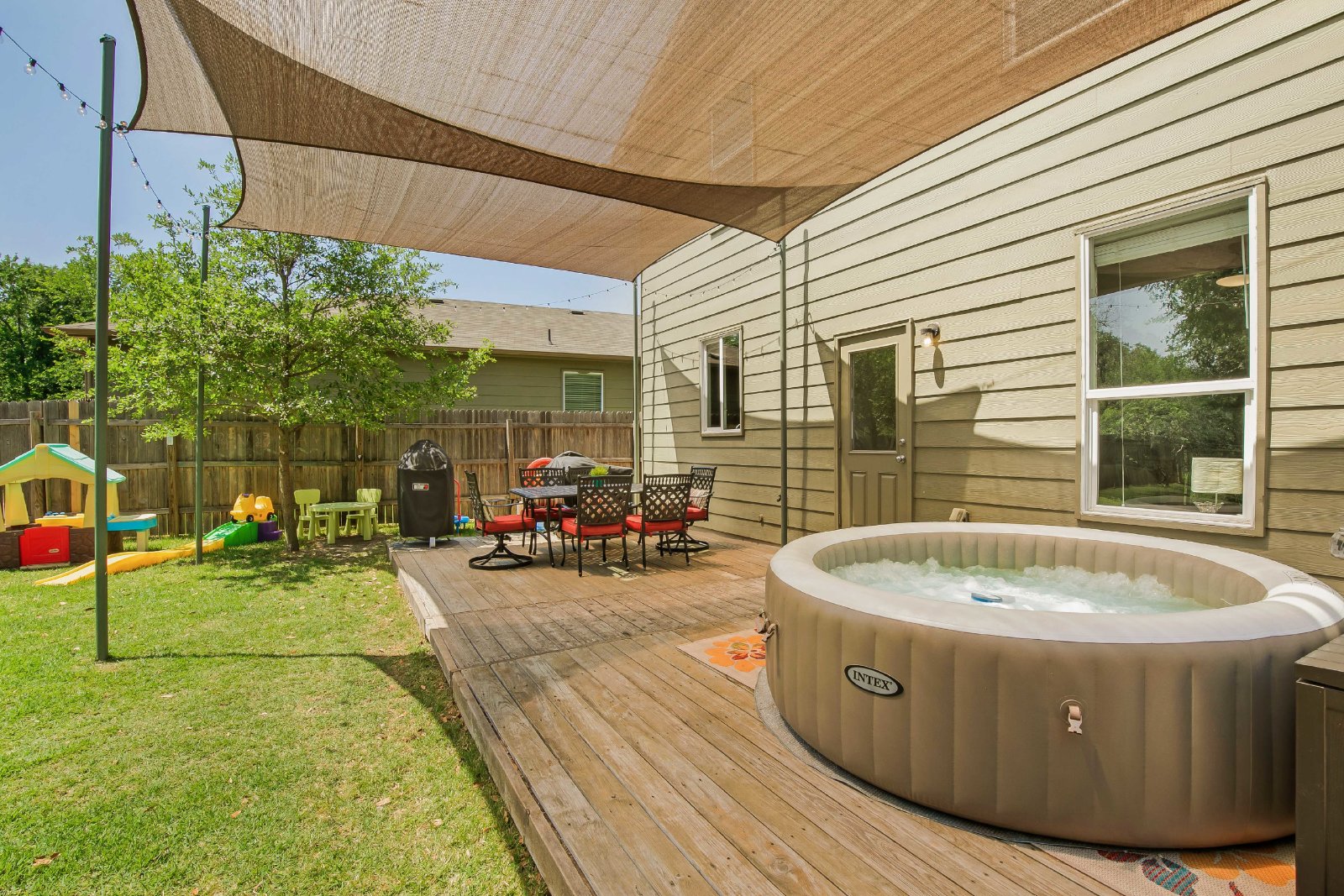 - Located on a quiet street in The Woodlands community, this beautifully updated 3bd/2.5ba plus bonus room has it all! Downstairs provides a useful open concept design, with upgraded finishes such as butcher block island, stainless steal appliances, pantry and bright living room overlooking a beautifully landscaped yard that backs up to the greenbelt. An extra bonus to this home is the small, conditioned back house that could be used as an office or studio with it's hardwood laminate floors and energy efficient mini-split AC system. A covered patio and ample trees provide excellent shade. Upstairs is fully carpeted and includes a master bedroom with ensuite, full laundry room, two additional guest rooms as well as a bonus room that has endless possibilities and excellent use of space. Enjoy the community amenities such as pool, playgrounds, walking trails and just minutes away from Lake Walter E. Long and Park. Home does not include hot tub or washer and dryer currently.